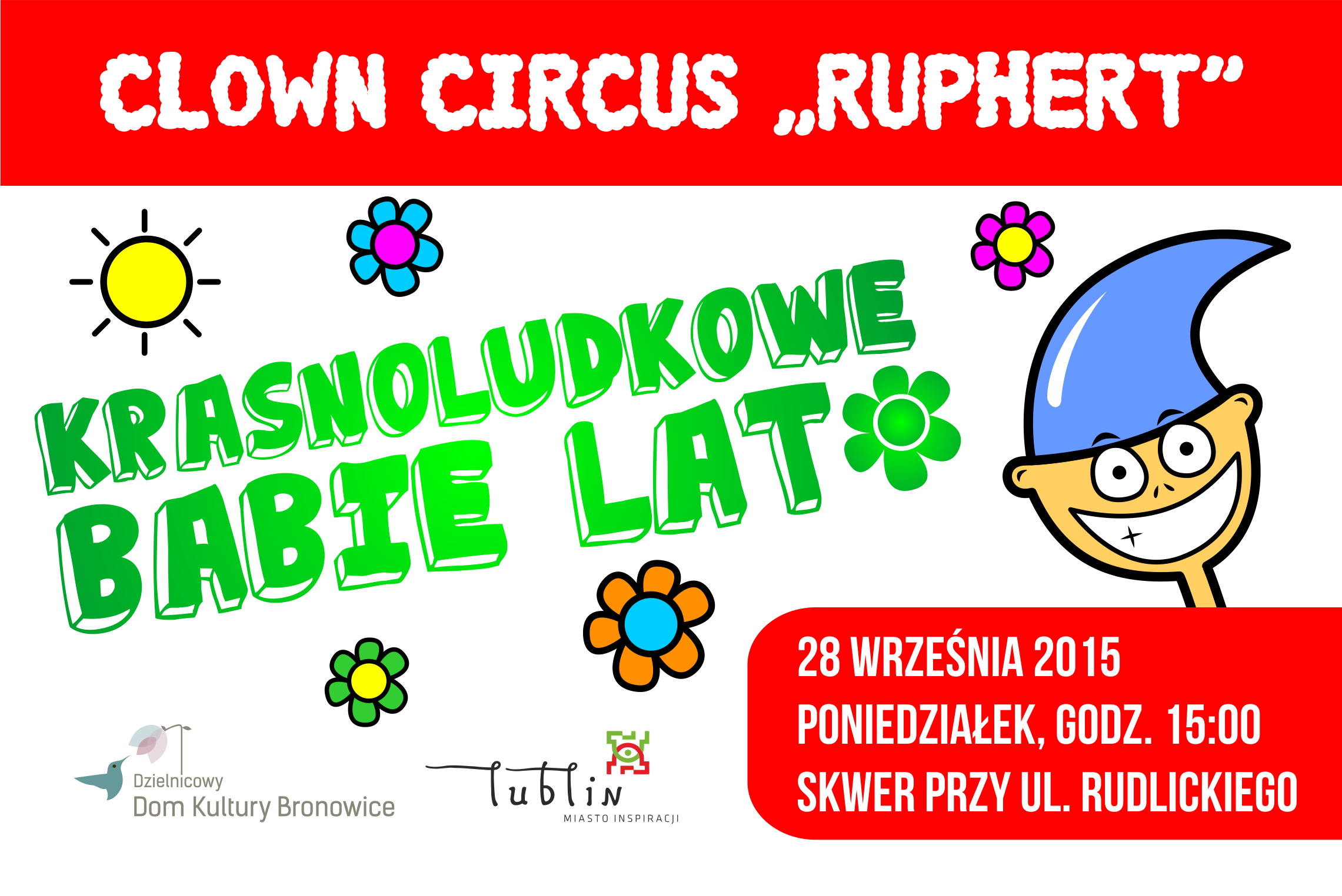 Rozpoczynamy Nowy Sezon Kulturalny 2015/2016! Zapraszamy na wyjątkowe familijne wydarzenie plenerowe z cyklu "Krasnoludkowe Babie Lato", rozpoczynające nasz Nowy Sezon Kulturalny 2015/2016 w głównej siedzibie Dzielnicowego Domu Kultury "Bronowice". Serdecznie zapraszamy całe rodziny na wspólne zabawy z Ruphertem i Rico, których z wielką radością gościć będziemy w trakcie Ich europejskiego tournee :) Nie zabraknie malowania twarzy dzieci, olbrzymich tańczących dmuchańców, wyrzutni confetti, fajer...