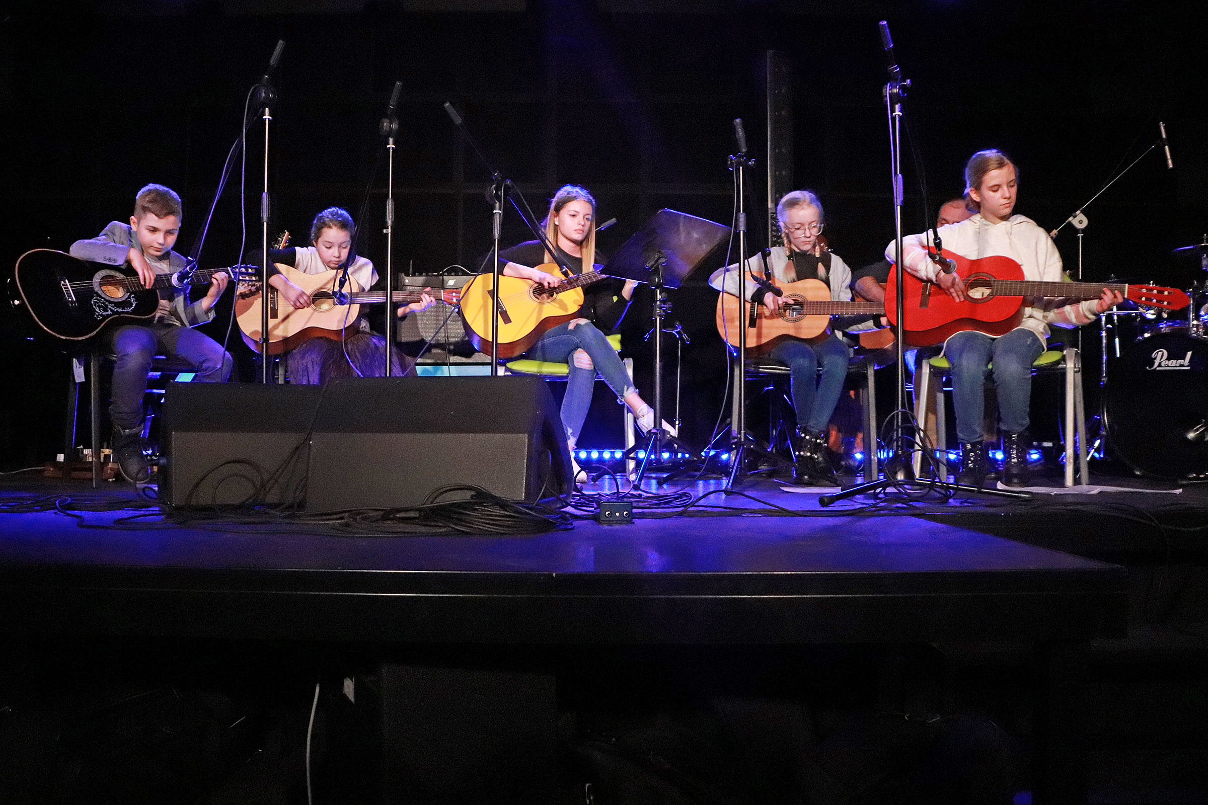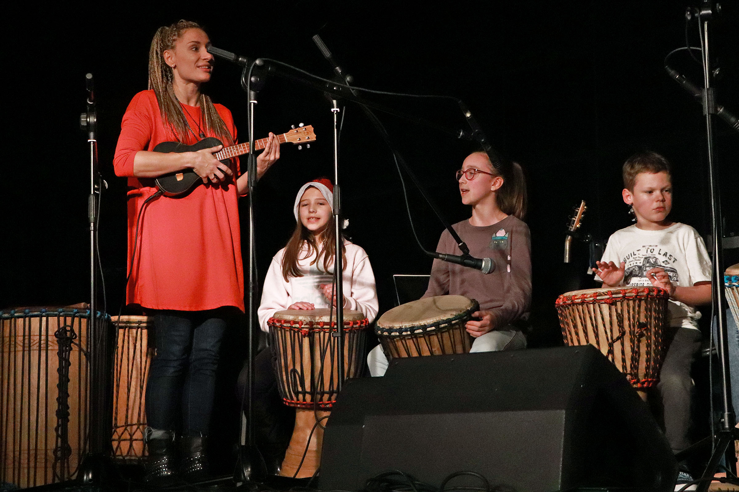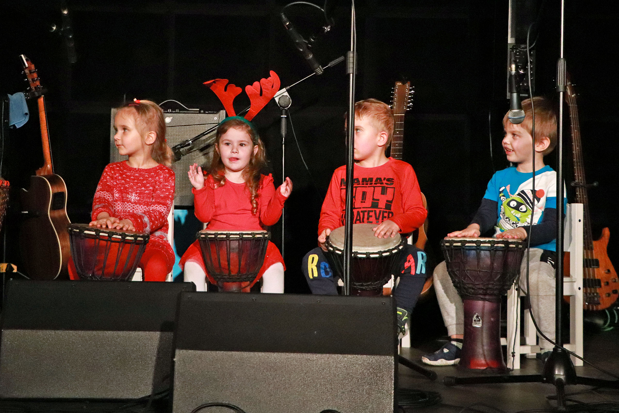 Podczas Mikołajkowych Spotkań Muzycznych zaprezentowały się wszystkie grupy muzyczne, działające w Dzielnicowym Domu Kultury "Bronowice" oraz w naszych dwóch filiach. Na scenie gościliśmy zarówno adeptów sztuki gry na gitarze, uczestników warsztatów wokalnych, bębniarskich i gry na ukulele, a także zespoły muzyczne, szlifujące swoje umiejętności podczas zajęć Tworzymy BAND. Dodatkowo w specjalnym, wspólnie wykonanym utworze swoimi umiejętnościami pochwalili się także wszyscy nasi instruktorzy, łącząc: wokal, dwie gitary i djembe.
