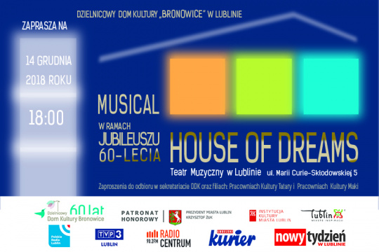 Serdecznie zapraszamy na Galę Jubileuszową 60-lecia Dzielnicowego Domu Kultury "Bronowice", która odbędzie się w piątek – 14 grudnia 2018 roku – o godzinie 18:00 w sali Teatru Muzycznego w Lublinie, przy ul. Marii Curie-Skłodowskiej 5. Podczas uroczystej Gali zaprezentujemy wyjątkowy musical pt. „House of Dreams”, który powstał specjalnie z okazji Jubileuszu 60-lecia Dzielnicowego Domu Kultury „Bronowice” w Lublinie. Jest on formą artystycznego podsumowania działalności instytucji, jak również z...