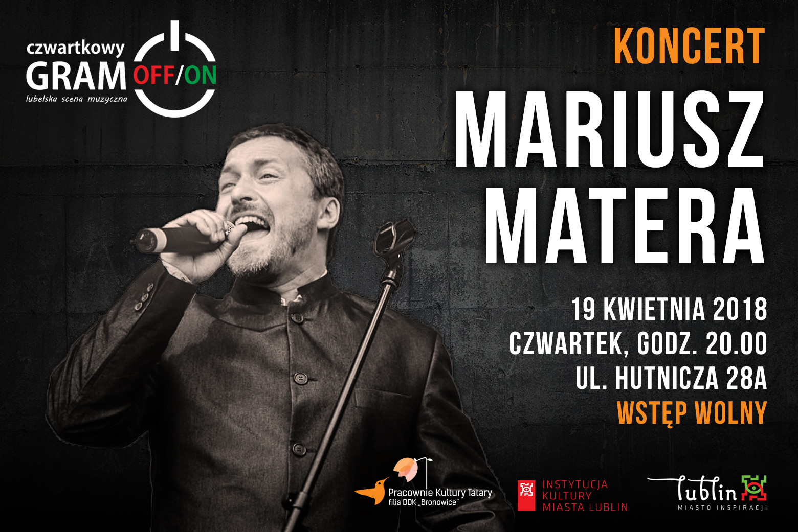 Pracownie Kultury Tatary z niebywałą radością zapraszają Państwa na kolejny koncert z cyklu "Czwartkowy Gram-OFF/ON", w ramach którego zapraszamy naszych, lubelskich artystów, tworzących wartą wypromowania muzykę! W czwartek, 19 kwietnia 2018 r., o godzinie 20:00 zapraszamy na koncert Mariusza Matery! Mariusz Matera swój pierwszy występ artystyczny zaliczył w 1974 roku, w Szkole Podstawowej nr 5. Zaśpiewał na scence utwór zespołu No To Co pt. "Ballada ratuszowego zegara". Był to jednocześnie jeg...