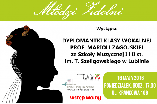 Dzielnicowy Dom Kultury "Bronowice" w Lublinie zawsze daje szansę zaistnieć młodym, utalentowanym ludziom. Właśnie dlatego co jakiś czas organizowane są koncerty z cyklu "Młodzi Zdolni". Tym razem swoje umiejętności zaprezentują dyplomantki Klasy Wokalnej Szkoły Muzycznej I i II stopnia im. T. Szeligowskiego w Lublinie, pod kierunkiem prof. Marioli Zagojskiej - Monika Kowalczyk i Patrycja Cichocka. Mamy nadzieję, że dzięki koncertowi Młode Artystki nabędą pewności na scenie i poczują się lepiej ...