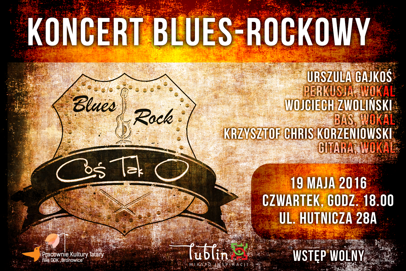 Pracownie Kultury Tatary z niebywałą radością zapraszają Państwa na nowy cykl wydarzeń zatytułowany "Czwartkowy Gram-OFF/ON". W ramach cyklu będziemy zapraszać naszych, lubelskich artystów, którzy tworzą wartą wypromowania muzykę! W czwartek, 19 maja 2016 r., o godzinie 18:00 zaprezentuje się zespół COŚ TAK O! Grupa ta, to klasycznie trzyosobowy skład. Grają blues-rocka z elementami energetycznego rock'n'rolla. W sierpniu 2013 roku zajęli II miejsce podczas IX Siemiatycze Blues Festiwal....
