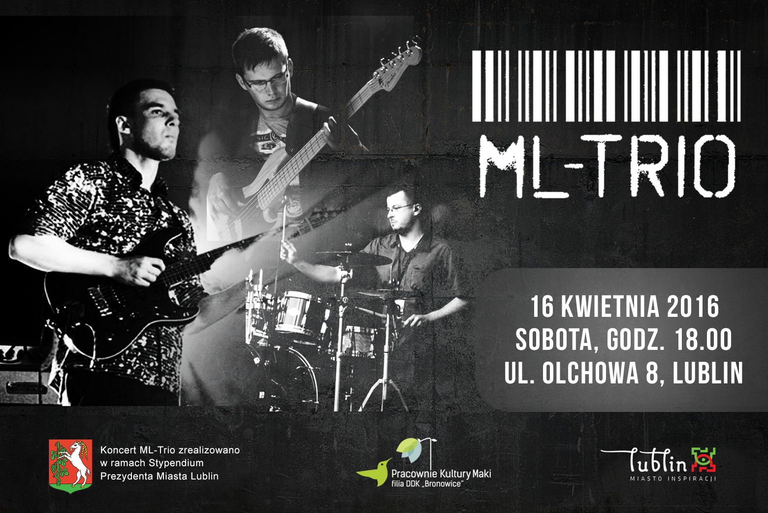 W sobotę, 16 kwietnia 2016 roku o godzinie 18:00, w Pracowniach Kultury Maki wystąpi zespół ML-Trio! Jest to projekt muzyczny założony przez gitarzystę Michała Lewartowicza. Muzyka grana przez ML-Trio to jazz-fusion w czystej postaci. Większość kompozycji wykonywanych na koncertach to autorski materiał lidera projektu. W wykonywanej muzyce słychać wpływy takich gitarzystów jak Scott Henderson, Mike Stern czy Wayne Krantz. KONCERT REALIZOWANY W RAMACH STYPENDIUM ARTYSTYCZNEGO PREZYDENTA MIASTA L...