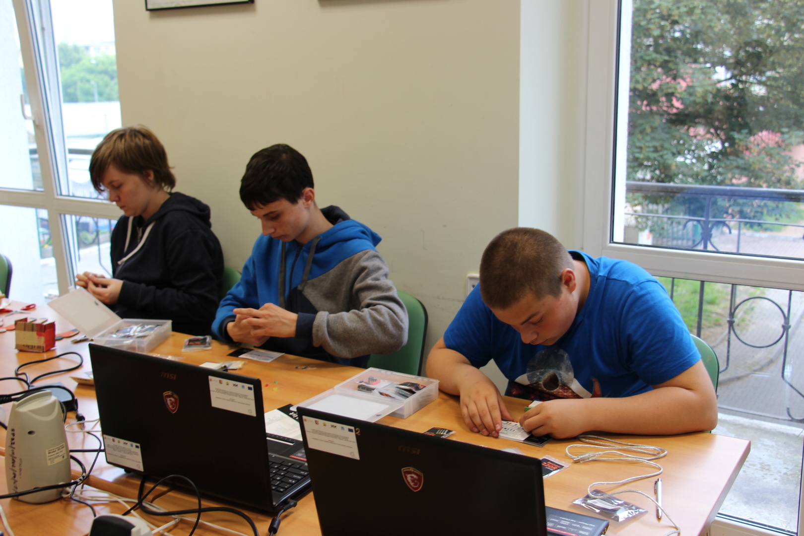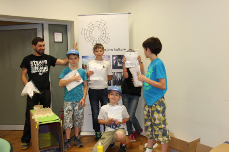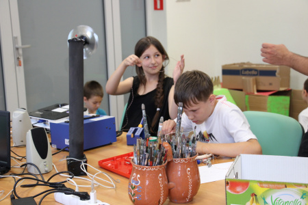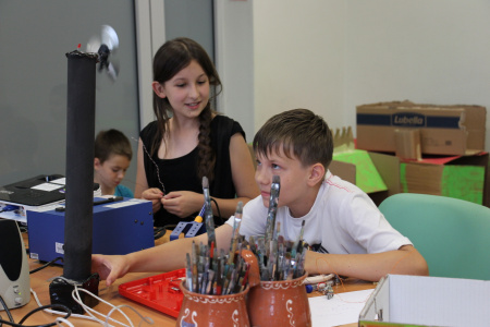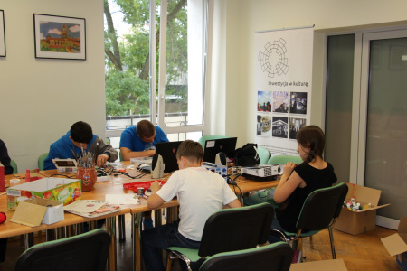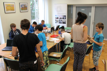 Trzeci, i ostatni zarazem, dzień cyklu był bardzo męczący. Powstały między innymi: kartonowy wiatrak napędzany z portu USB, gra w piłkarzyki, koszykówkę, mrugające diodami LED domki, czy grająca zabawka z wmontowanym przez Pawła, jednego z Uczestników, potencjometrem... Atrakcji było co niemiara, a na zakończenie – miła niespodzianka w postaci projektowych gadżetów. Radości nie było końca. Uszczęśliwieni byli również rodzice, którzy transportowali do domów wytwory swoich pociech... ;) - 19 czerwca 2015 r.
