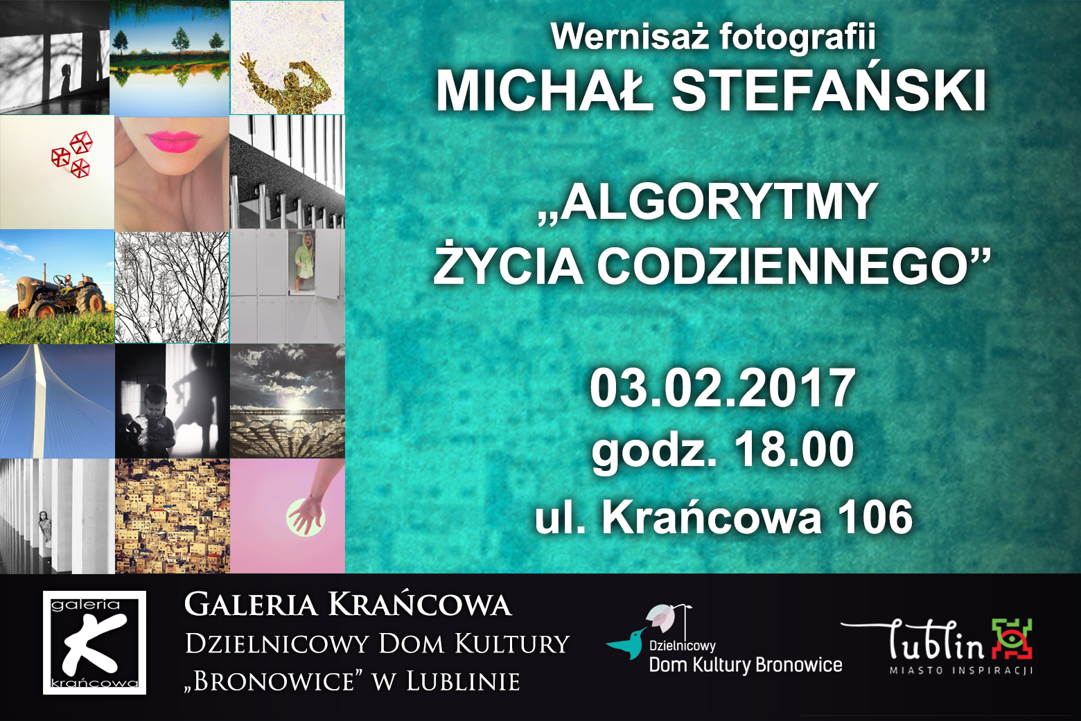 Zapraszamy do Galerii Krańcowej na wystawę fotografii Michała Stefańskiego pt. „Algorytmy życia codziennego”. Wernisaż wystawy odbędzie się 3 lutego 2017 roku, o godzinie 18. Wystawę będzie można oglądać od 3 lutego 2017 r. do 2 marca 2017 r. w Galerii Krańcowej. Z faktem, iż „najlepszym aparatem fotograficznym jest ten, który mamy przy sobie” trudno się nie zgodzić. Wykorzystywanie telefonów komórkowych do uwiecznienia kadrów codzienności, a następnie udostępnianie ich za pośrednictwem serwisów...