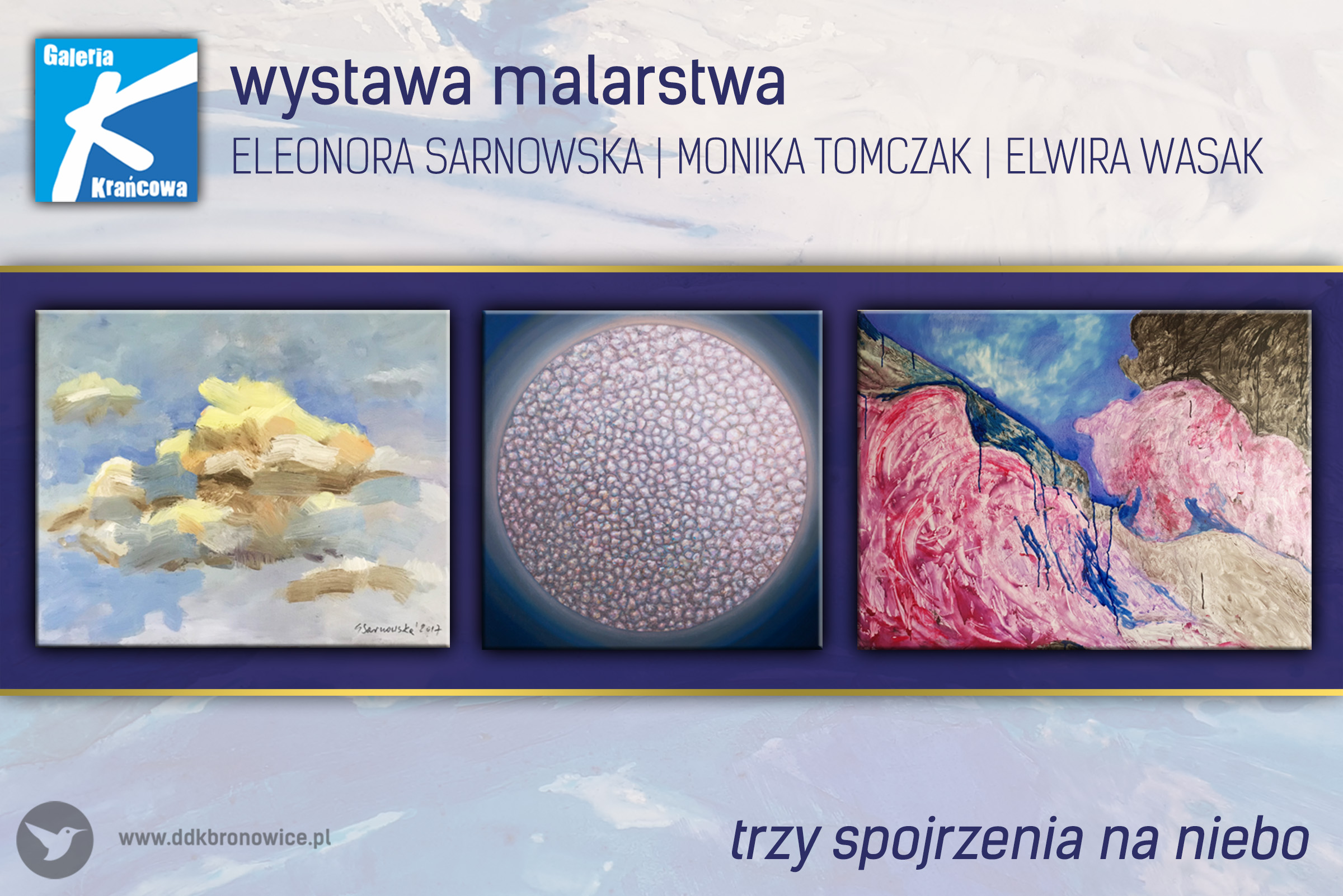 Zapraszamy do Galerii Krańcowej na wystawę malarstwa Eleonory Sarnowskiej, Moniki Tomczak i Elwiry Wasak, zatytułowaną „Trzy spojrzenia na niebo”. Wystawę będzie można oglądać od 8 października do 8 grudnia 2021 r. w Galerii Krańcowej.