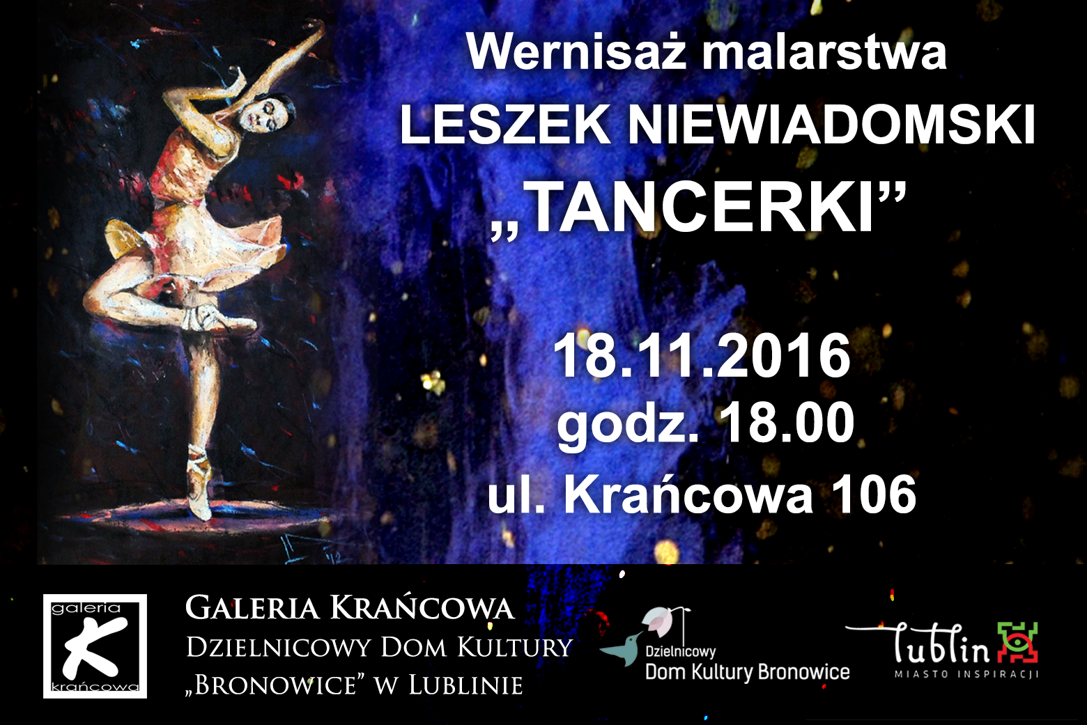 Zapraszamy do Galerii Krańcowej na wystawę prac Leszka Niewiadomskiego wykonanych techniką pastelu, pt. "Tancerki". Wernisaż wystawy odbędzie się 18 listopada 2016 roku, o godzinie 18. Wystawę będzie można oglądać od 18 listopada 2016 r. do 5 grudnia 2016 r. w Galerii Krańcowej. Leszek W. Niewiadomski urodził się w 1953 roku w Lublinie. Jest absolwentem Instytutu Wychowania Artystycznego UMCS, gdzie uzyskał dyplom z wyróżnieniem pracowni malarstwa prof. Ryszarda Lisa. Zorganizował 38 wystaw auto...