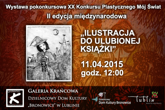 Zapraszamy do Galerii Krańcowej na wystawę pokonkursową XX Wojewódzkiego Konkursu Plastycznego "Mój Świat" II edycja międzynarodowa pt. "Ilustracja do ulubionej książki". Wernisaż wystawy odbędzie się w sobotę, 11 kwietnia, w samo południe. Zostaną wręczone nagrody i wyróżnienia oraz nastąpi uroczyste otwarcie wystawy pokonkursowej. Gratulujemy wszystkim zwycięzcom i zapraszamy wszystkich do podziwiania nagrodzonych i wyróżnionych prac. Wystawę będzie można oglądać od 11 kwietnia 2015 r. do 14 m...
