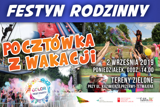„Pocztówka z wakacji” to doskonała okazja, aby powspominać wakacyjne przygody, letnie podróże i z uśmiechem rozpocząć rok szkolny. Wśród licznych atrakcji nie zabraknie zdolnych rąk, które wyczarują niesamowite obrazy na dziecięcych buziach oraz towarzyszyć nam będą skoczne dźwięki, do których zaprosimy i dużych, i małych. W trakcie naszego festynu rodzinnego odbędzie się również Color Fest Party, czyli największa impreza muzyczna w kraju, na którą zaproszeni mogą czuć się wszyscy: dzieci, młodzież i dorośli - całe rodziny, uczniowie, studenci oraz seniorzy! Przygotowaliśmy kolorowe proszki Holi najwyższej jakości, ale także kolorowe serpentyny w sprayu, kolorowe balony z helem, kolorową watę cukrową i kolorowe lody! Świetna muzyka, uśmiechnięci ludzie i zabawa kolorami Holi to najlepszy przepis na udany dzień z kolorowo-pozytywną atmosferą!