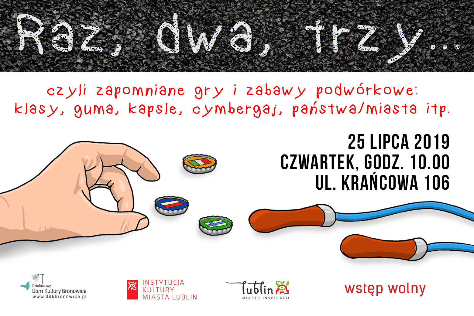 W czwartek, 25 lipca 2019 roku, od godziny 10:00 zapraszamy na warsztaty plenerowe pt. "Raz, dwa, trzy... zapomniane podwórkowe gry". Zapraszamy dzieci i młodzież, którym znudziły się już kolorowanki i znane na pamięć bajki, ale także rodziców i dziadków na rodzinne warsztaty, podczas których przypomnimy kultowe zabawy podwórkowe z czasów naszego dzieciństwa. Zachęcamy gorąco rodziców, by włączyli się do wspólnej aktywności i wykorzystali owe zabawy jako most łączący pokolenia.