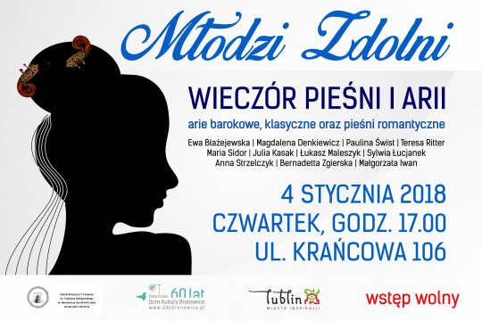 W czwartek, 4 stycznia 2018 r., o godzinie 17:00 wystąpią w głównej siedzibie Dzielnicowego Domu Kultury "Bronowice", przy ul. Krańcowej 106, prezentując arie barokowe, klasyczne oraz pieśni romantyczne.