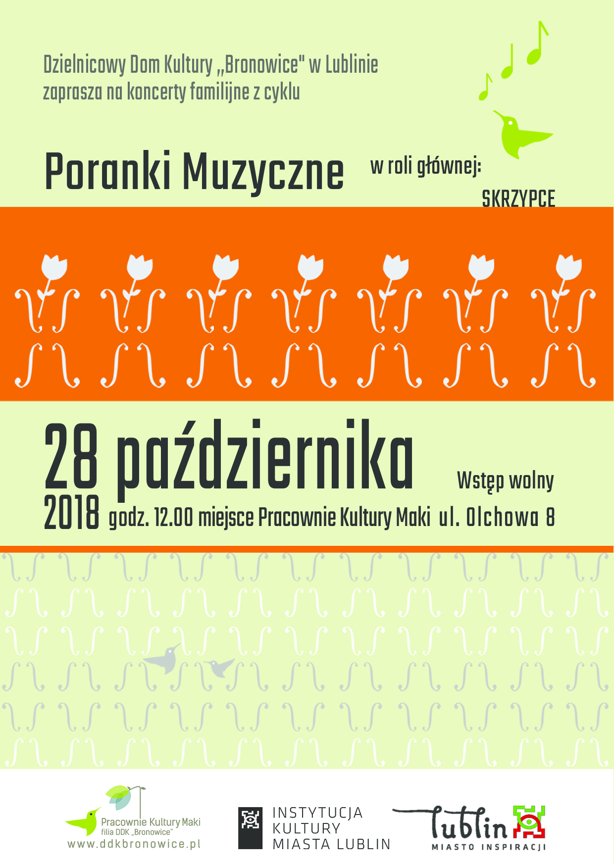 Podczas drugiej w tym sezonie odsłony Poranków Muzycznych w roli głównej wystąpią skrzypce - solo i w duecie - oraz fortepian. Uczestnicy będą mogli zapoznać się z budową oraz charakterystycznym brzmieniem instrumentów, biorących udział w koncercie, a także posłuchać ich pięknego dialogu. Będziemy również kontynuować naukę nutek i ich zapisu na pięciolinii. Wśród wykonanych utworów znajdzie się przekrój kompozycji od Bacha do jazzu, w tym Marsz Turecki Wolfganga Amadeusza Mozarta oraz Menuet Luigiego Boccheriniego.