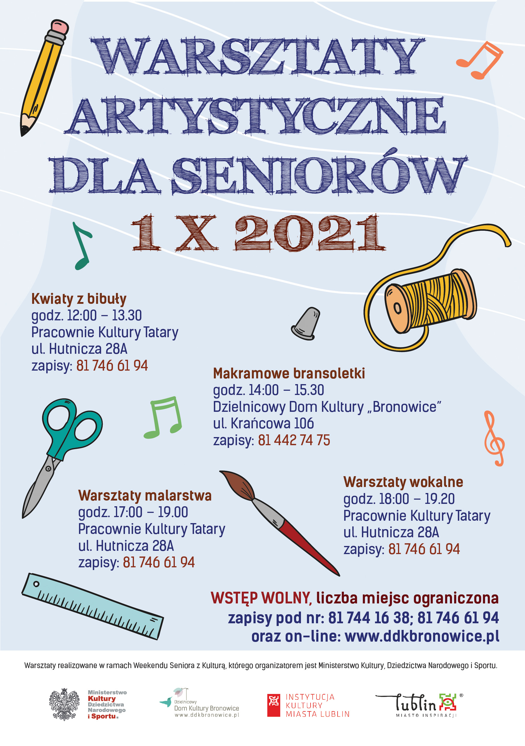 Na wszystkie warsztaty obowiązują zapisy poprzez poniższy formularz lub telefonicznie pod numerami telefonów: 81 744 16 38 oraz 81 746 61 94. Liczba miejsc jest ograniczona.