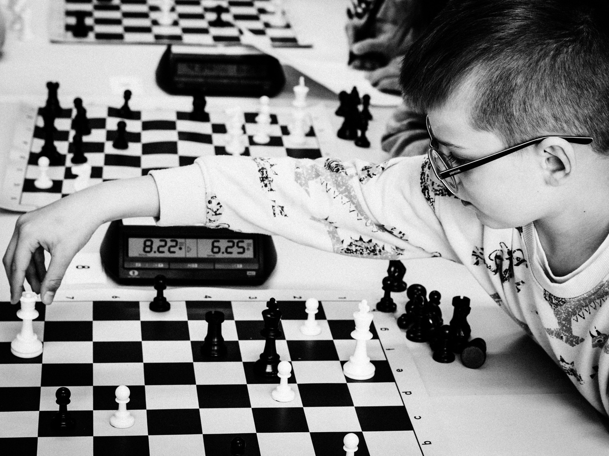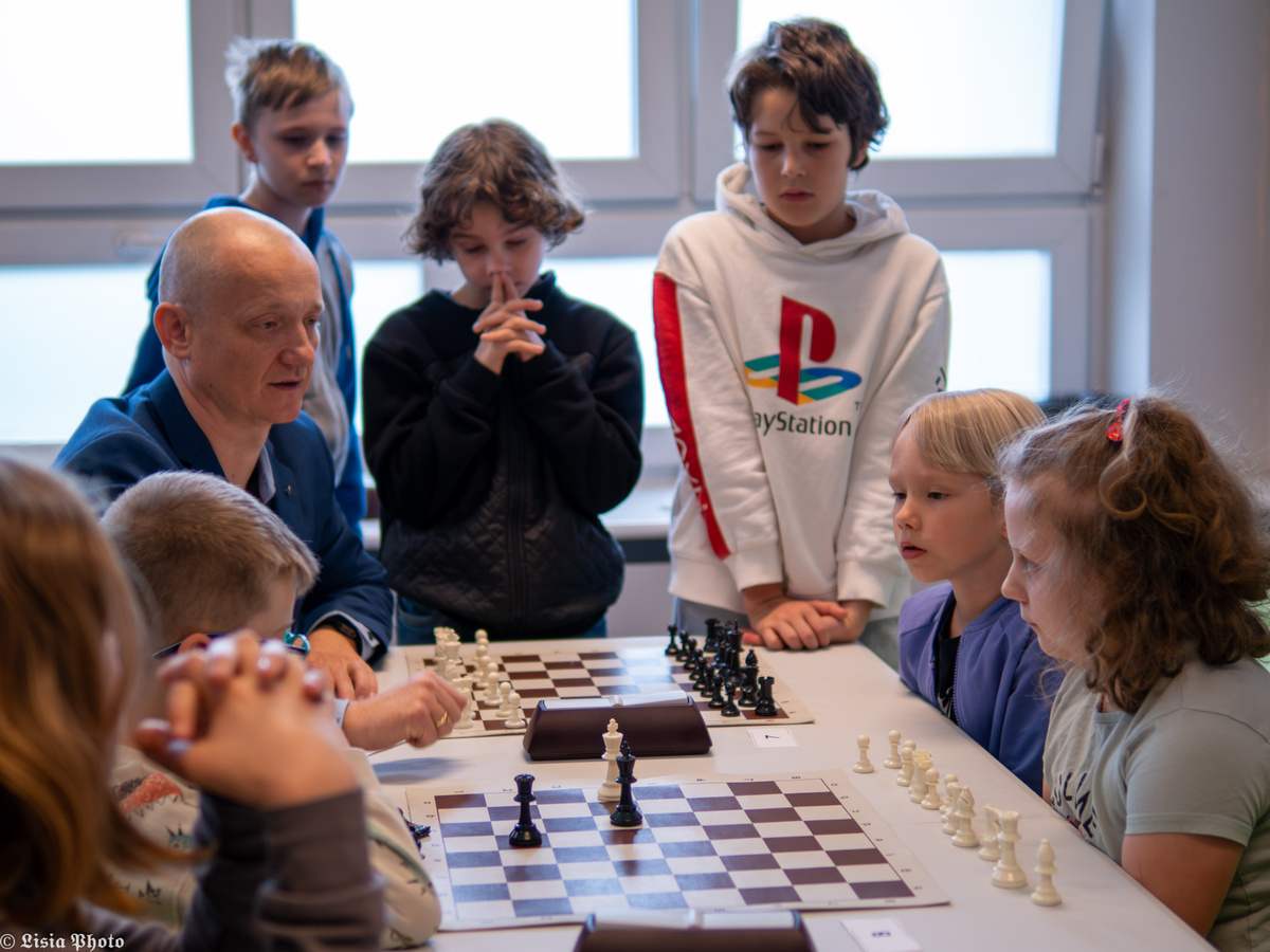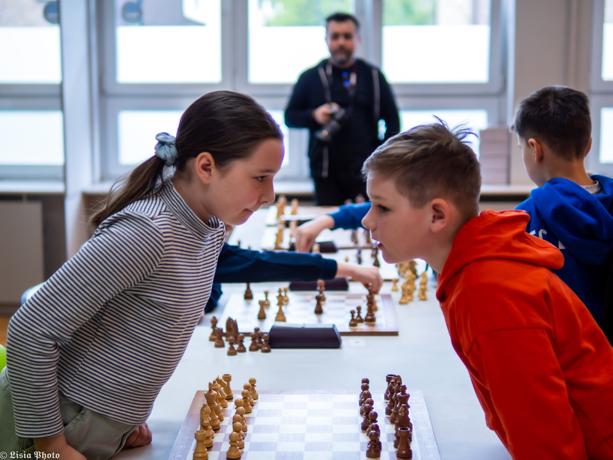 Czarno-białe fotografie Piotra pokazują napięcie i koncentrację młodych szachistów. Jego prace to minimalistyczne kompozycje, które oddają głębię emocji, towarzyszących każdemu ruchowi na szachownicy. Zdjęcia autorstwa Justyny są pełne żywych barw i dynamiki. Dzięki jej kolorowym kadrom możemy zobaczyć radość, entuzjazm oraz pasję młodych uczestników turnieju – kalejdoskop momentów, które ukazują nie tylko rywalizację, ale także przyjaźń i wspólne przeżycia młodych szachistów.